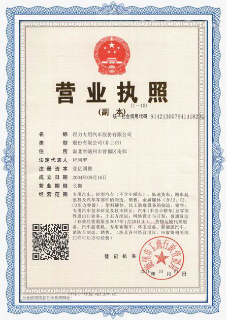 程力專用汽車股份有限公司各類專用汽車的專業(yè)廠家,大型專用汽車廠。國內(nèi)園林綠化、石油化工、市政環(huán)衛(wèi)、壓力容器專用汽車商。注冊“程力威”牌,產(chǎn)品代碼:“CLW”。東風(fēng)、解放、福田、重汽、陜汽、北奔等公司的重要合作伙伴,主要從事各類專用汽車的業(yè)務(wù),同時(shí)也銷售各大型廠家的整車及配件。公司擁有自行出口權(quán),其主導(dǎo)品種有灑水車系列、吸污(吸糞)車系列、垃圾車系列、掃地車系列、油罐加(運(yùn))油車系列、高空作業(yè)車系列、清障車系列、隨車吊系列、自卸車系列、教練車系列、半掛車系列、化工車系列、消防車系列、廂式(冷藏車)系列、牽引車系列、粉粒物料車系列、攪拌車系列、壓力容器系列、專用車配件等十八大系列300多個品種車型。同時(shí)批發(fā)東風(fēng)、解放、楚風(fēng)各種二類底盤。